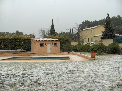 Now, moving on to Christmas... Christmas Eve (the "Reveillant," "waking up" in French) we started eating at around 7:30. Small appetizers with an aperitif wine, then the dinner started. Raw oysters, shrimp, salmon, and mussels with butter, parsley, and garlic with white wine. After that everyone had of course eaten pretty well, so we took a break and opened presents. Then more dinner of roasted salmon with Camargian rice (a mixture of white and brown rice from the local Camargue marshes). And finally, for dessert there was a ice cream "log" of vanilla and chocolate ice cream with a layer of chocolate. That, along with champagne, lychees, almonds, walnuts, hazelnuts, chocolate truffles, and fruit as you please.